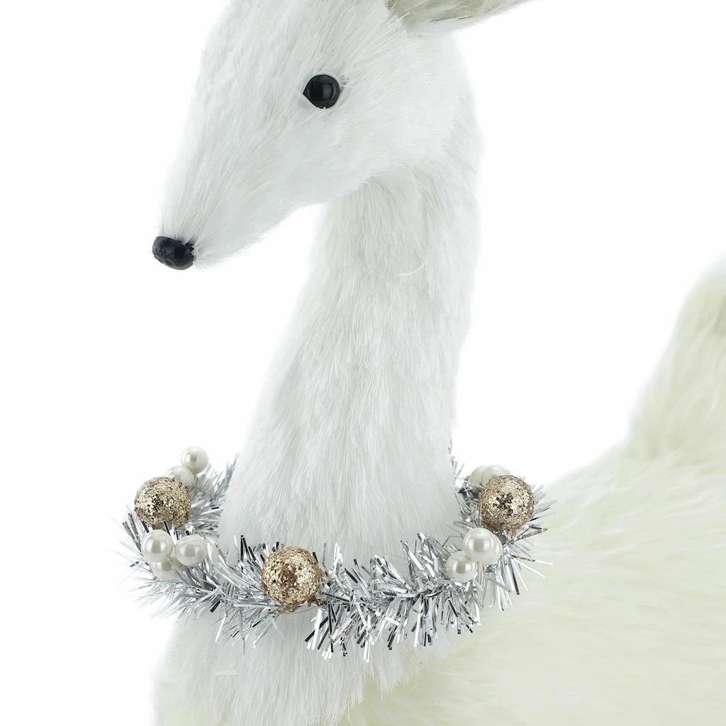 With glittery silver antlers and a wreath of tinsel and ornaments around its neck, this lovely standing deer figurine is sure to bring festive cheer to your home. Display this charming piece alongside a miniature golden tree decked out in sparkly ornaments on your mantel for the holiday season.